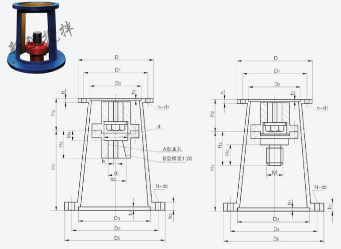 本機架適用于擺線針輪減速機的聯接,配剛性聯軸器,上聯軸器裝JA型直孔,下聯軸器裝A型直孔或B型錐孔,錐度為1:20的聯軸器。該機架無支承適用于反應器傳來的軸向力不大時使用。